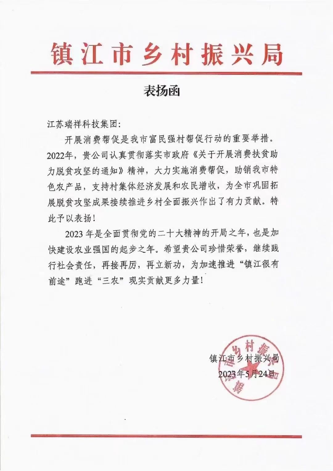 近日,鎮(zhèn)江市鄉(xiāng)村振興局向瑞祥科技集團(tuán)發(fā)來(lái)表?yè)P(yáng)函,函文中對(duì)瑞祥在助力全市鞏固脫貧攻堅(jiān)成果接續(xù)推進(jìn)鄉(xiāng)村全面振興工作做出的貢獻(xiàn),給予了充分的肯定和表?yè)P(yáng)。近年來(lái),瑞祥科技集團(tuán)積極落實(shí)市區(qū)各級(jí)黨委政府安排部署,認(rèn)真領(lǐng)悟貫徹《關(guān)于開(kāi)展消費(fèi)扶貧助力脫貧攻堅(jiān)的通知》精神,在鄉(xiāng)村振興工作實(shí)踐中,始終堅(jiān)持服務(wù)“三農(nóng)”宗...